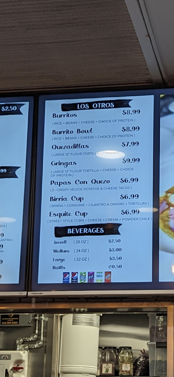 Alongside hearty mains, you’ll find small bites and sides like esquite cup and crispy tacos dorados that pair well with a cold beverage. The drink selections include familiar sodas and refreshing options to complement the meal.